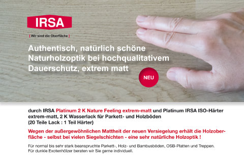 Herr Jürgen Pflüger stellte das neue IRSA 2K HP Plus in farblos und farbig (6 Standardfarben) und die alternativ einsetzbaren "Grundierungen" IRSA Lauge (6 Standardfarben), IRSA Basic Color (20 Standardfarben) oder IRSA Design Farböl (6 Standardfarben) vor. So können zahlreiche Farben mit individuellen Kombinationsmöglichkeiten hergestellt werden - einzigartig und schwer kopierbar.
