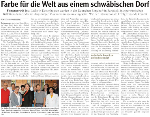 Lilo Sallinger ist seit über 30 Jahren geschäftsführende Gesellschafterin im Familienunternehmen IRSA Lackfabrik Irmgard Sallinger GmbH in Deisenhausen. IRSA stellt Versiegelungen, Wasserlacke, Öle, Farbsysteme, Pflege- und Reinigungsmittel zum Schutz von Holz im Innenausbau (insbesondere für Parkett- und Holzböden) sowie für den Außenbereich her – hinzukommen Oberflächenschutzmittel für Kork, Steinböden, Sportflugzeuge, Silo- und Stallböden und andere Bereiche. Ihr Vater galt als “Polyurethan-Pabst”, die Mutter Irmgard sorgte für innovative Wasserlacksysteme, welche die Tochter zusammen mit Ölen und Wachsen (zum Schreck der damaligen Lackindustrie!) weiter bzw. neu entwickelte. Heute werden bei IRSA mit fast 90%-Anteil nur verbraucher- und umweltfreundliche Profi-Produkte hergestellt und vermarket. Ein derzeitig laufendes Forschungsprojekt, gemeinsam mit einer Wiener Universität, wird die Innovationsfähigkeit von IRSA weiter unter Beweis stellen.